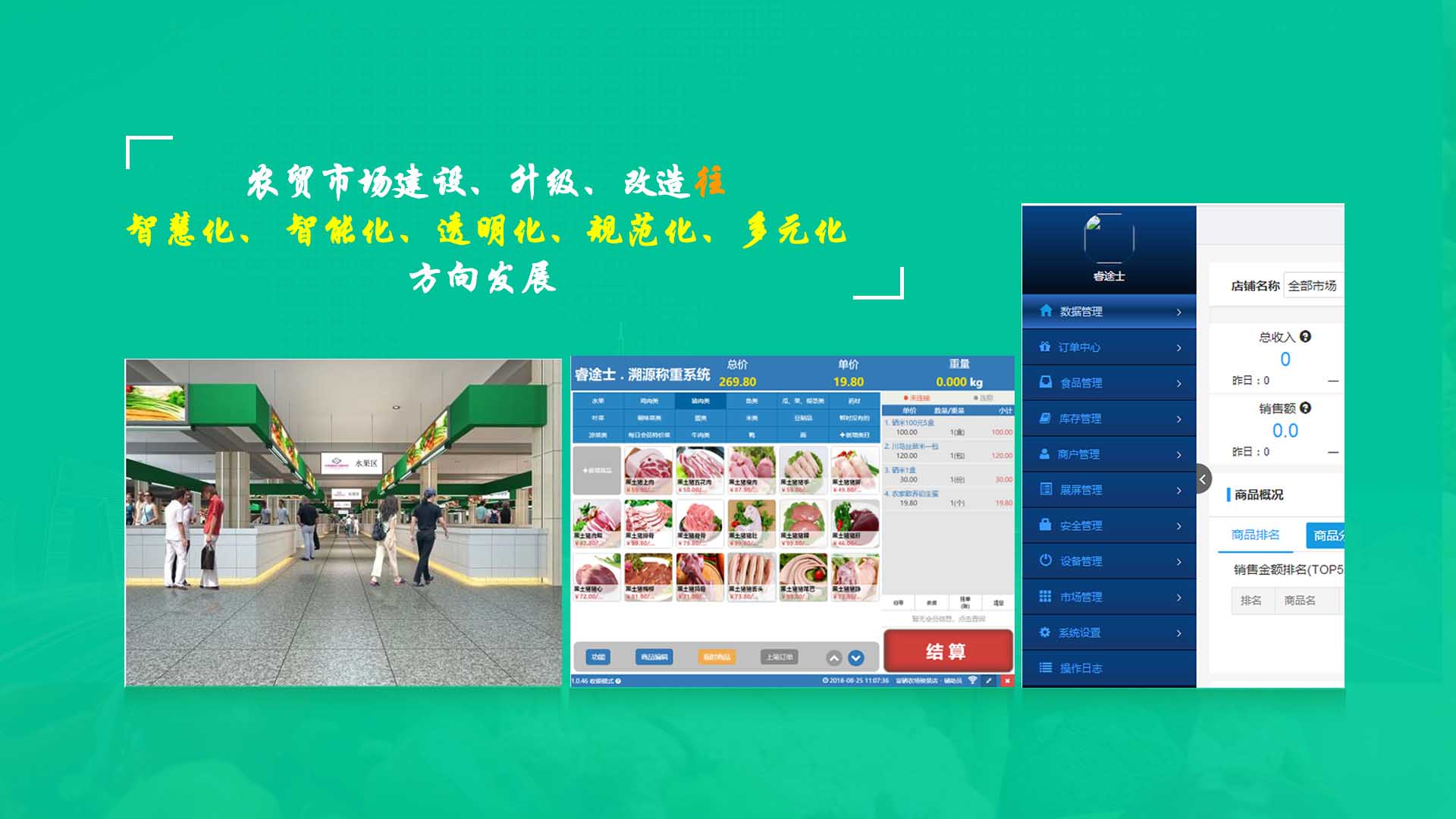 【睿途士首創】顛覆傳統的“智慧農貿市場系統”,解決了傳統農貿系統單一安卓掛屏,昂視不方便看、不直觀、無互動性,傳輸信息不齊全、不穩定的問題,也解決了按鍵電子秤商品難找、商品代碼難記、按鍵操作不靈活、支付不智能,對收銀管理、銷售商品、菜名、菜價、打折、優惠、會員、線上下單、采購等無法實現實際菜品交易和追溯等問題。